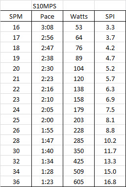 Having looked at the workouts that Paul recommends for his clients, they seem to be constrained to a relatively narrow range of paces from 2:00 to 1:45, which translates to rates between 25 and 30. I have also drawn the conclusion, but I’m not sure if it is true that S10MPS is a training technique, and then for time trials, and races and some high intensity interval sessions, you strap in and row to pace, without regard to maintaining 10 meters per stroke. The thing I find interesting about this is that it does really hammer home the idea of maintaining stroke power as you increase rate. You can see this with the SPI going way up as the paces get faster.