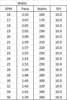 Anyway, having looked at all of this stuff, I have settled on using the simple idea of using linear increases of power with increasing stroke rate. I am using the 55% of 2K power formula to come up with a reasonable power level for 18SPM and increasing 10 watts for every 1 spm increase. This is not far off of the L4 levels and the same as the Biorow eWPS approach, It’s also handy because it’s easy to remember a 10 watt change for each rate. Here’s are my current targets.