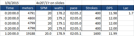 4×20’/1’r with lactate March 6, 2015March 6, 2015Leave a comment On slides. Continuing to work on better posture and proper sequencing. Tomorrow: Probably a harder 6K, target pace around 1:50.