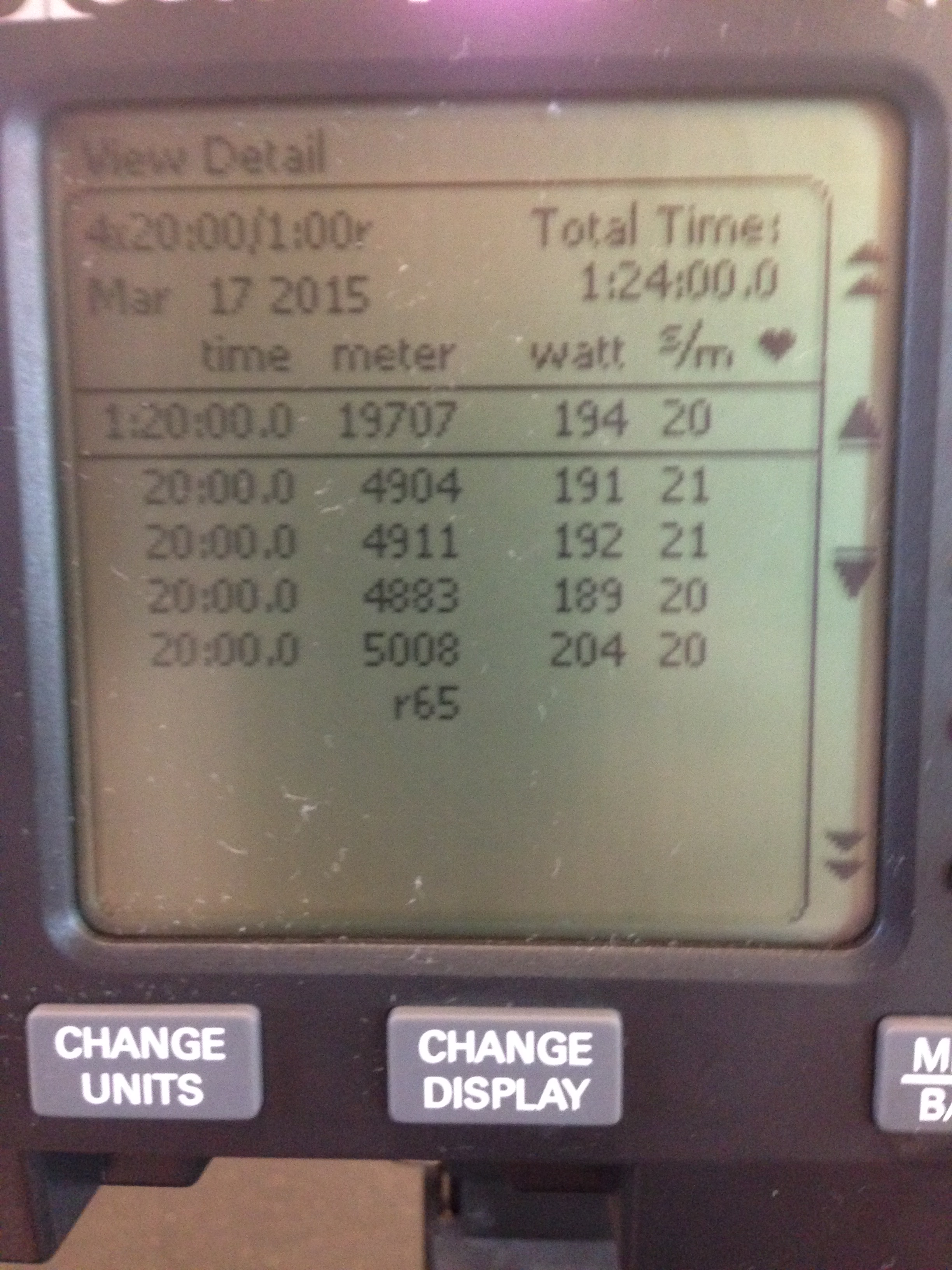 I just wanted to munch some meters today. I intended to row at 186W, but the atmosphere got to me and I ended up pushing harder and running a higher heart rate than I should have. My HR monitor started acting stupid after 40 minutes, but even before that I was pushing up into the low 150s. After 60 minutes, I had to make a decision to either slow it way down or have a little fun. I decided on fun in the form of a 20 minute L4 with these powers