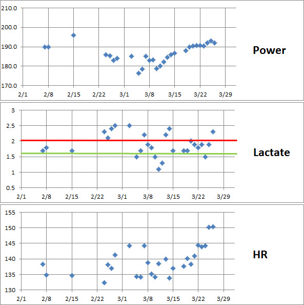 The past 7 session before today, I was able to hold >190W and measured <2.0 in every session. Yesterday, at 193W, my HR was way high, like 10BPM higher than normal, but the lactates were OK (1.9). Today, holding 192W, HR was just as far off and my lactates were 2.3. I dropped down to 190W and measured 2.8