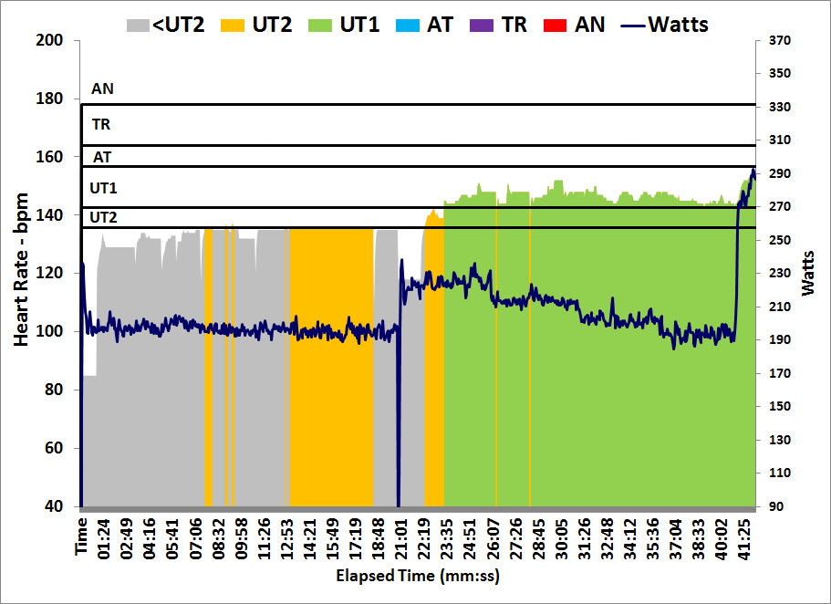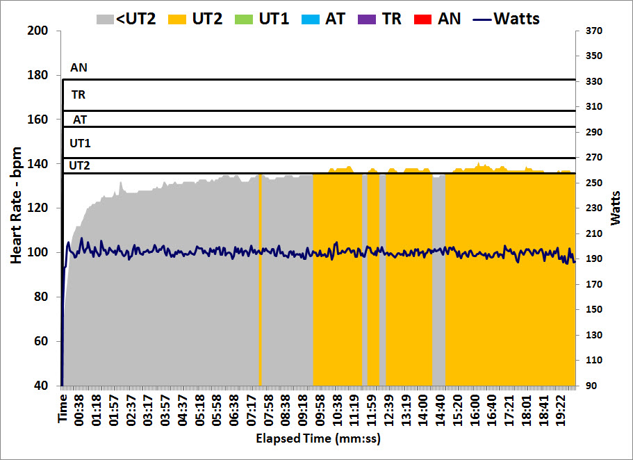 As usual, I started with a 20 minute lactate test. As usual for a Sunday, it felt easier than on any other day. Target was 193W, but I was having trouble getting it down below 195W. And my HR was nicely controlled and stayed below 140 throughout the piece.