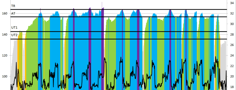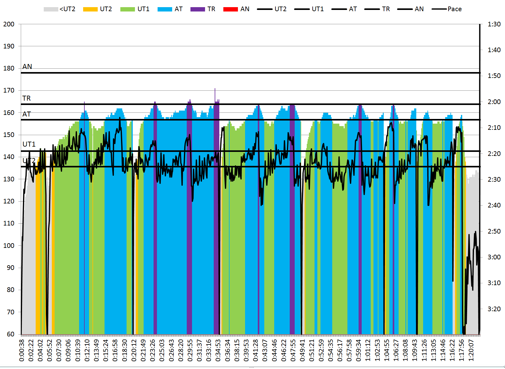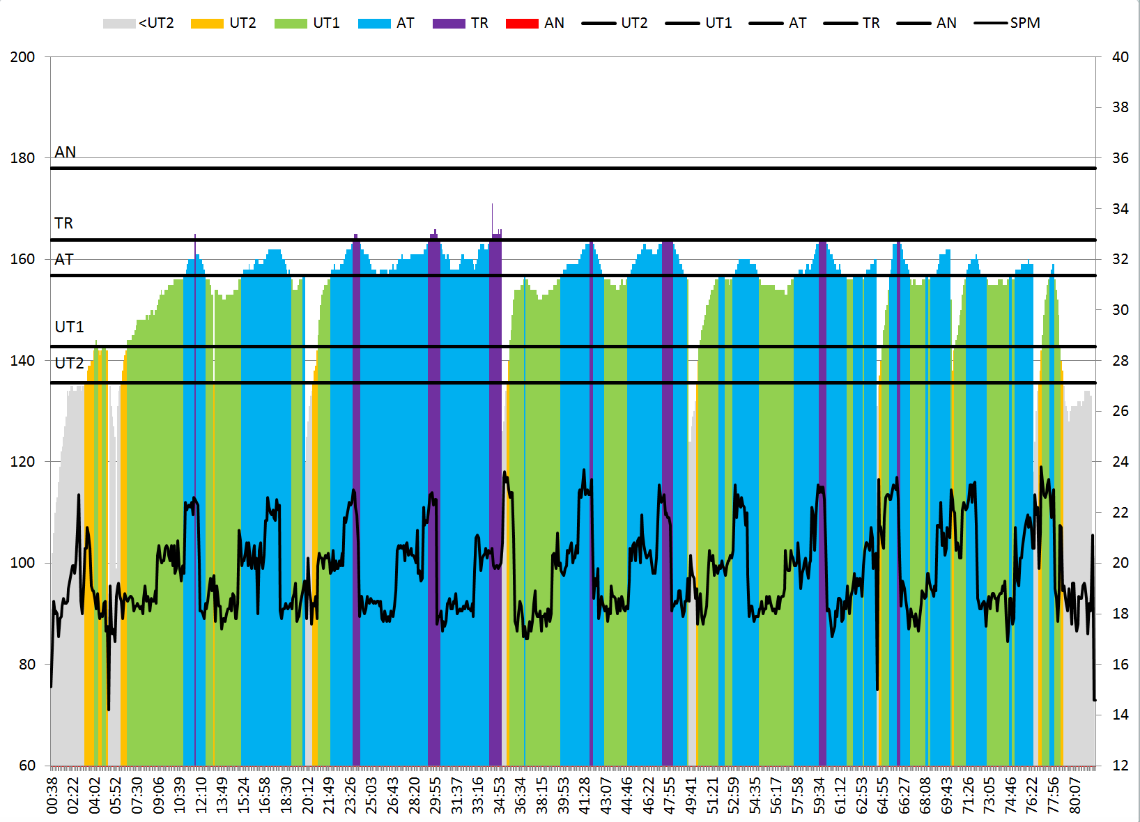 - Rate ladders (3′ @18, 2’@20, 1@22) repeat again and again. Stop whe I runout of river to turn and grab a drink and then right back into it.