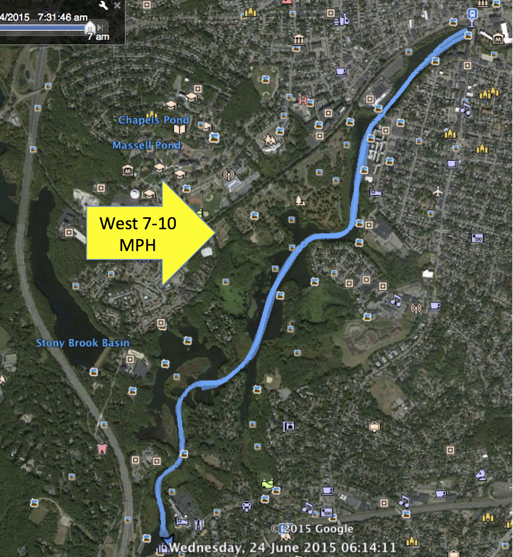 Conditions: Sunny, 65F, less humid. Wind W 7-10 mph. This was mainly a cross wind, but seemed like a head wind no matter which way I was rowing.