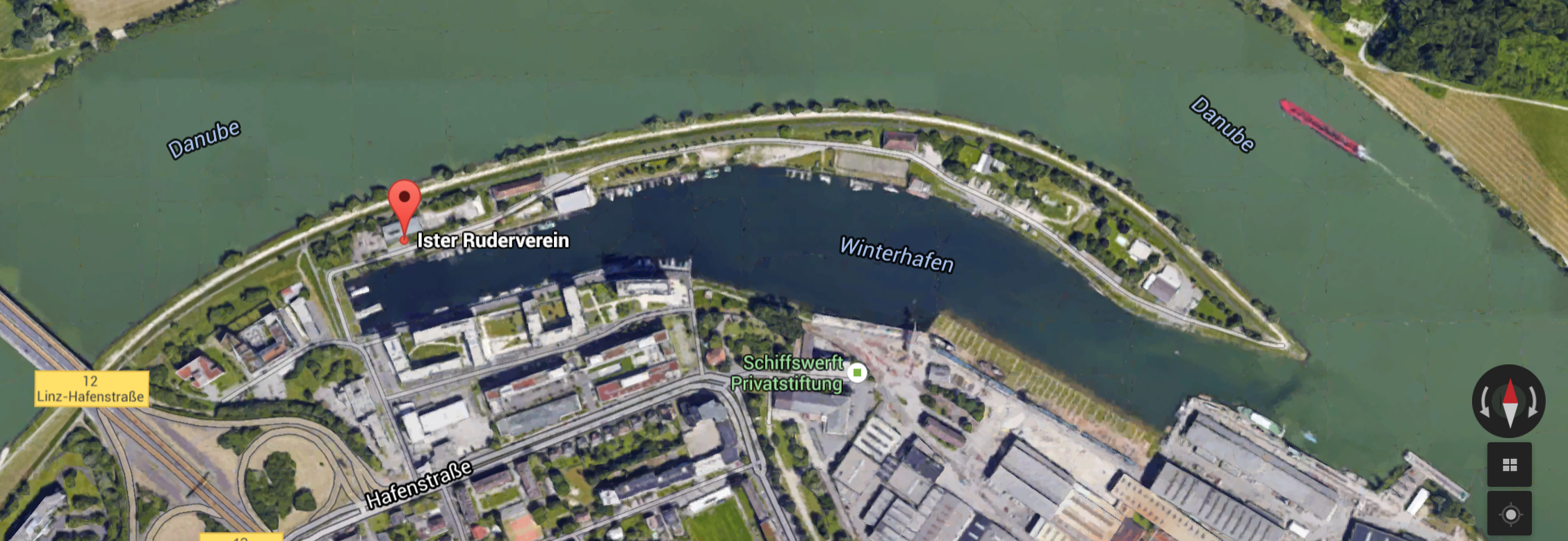 I am visiting Linz Austria, which is on the Danube river. So, while I when I was on my way, I googled “rowing club linz”, and remarkably, got a hit for Linzer Ruderverein Ister. More remarkably, the boathouse was 250 meters away from my hotel. Even more remarkably, after I arrived, I walked over to the club, met a nice gentleman, who hooked me up with another gentleman, who found someone to row with me this morning. The club is at the end of a 1km long inlet, shown with the pin on this view.