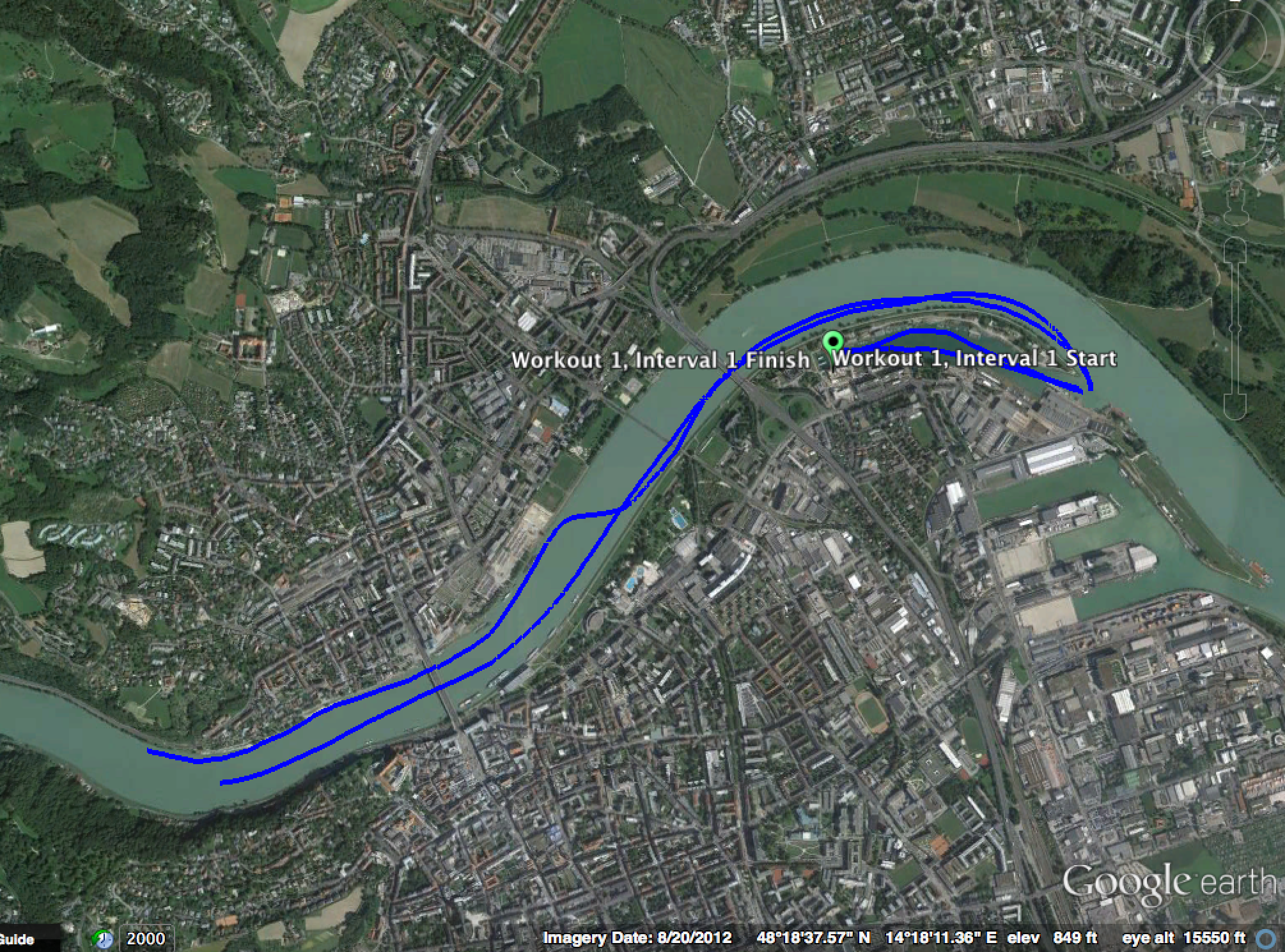 We rowed about 4 km upstream through downtown Linz to what he told me was the old boathouse location. It is now a private residence. Apparently up stream another few km is a world class 2K venue.