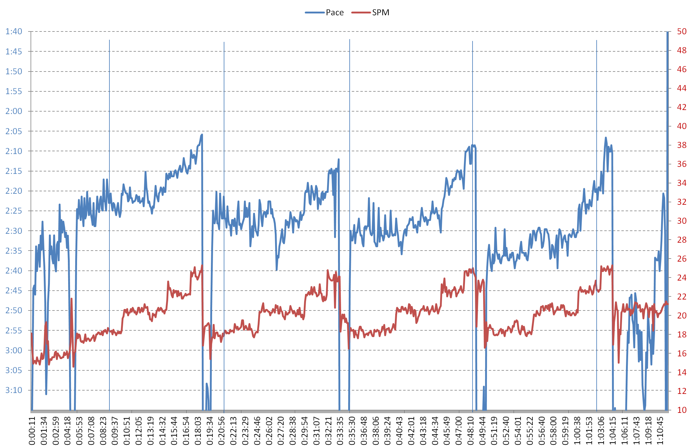 My HR monitor was not in the mood to work with the speedcoach, so the HR plots are from RIM. The pace and rate chart is from the speedcoach. You can see that the rate looks pretty good, but the pace is much better from the speedcoach (and you also lose the effect of upstream and down stream).
