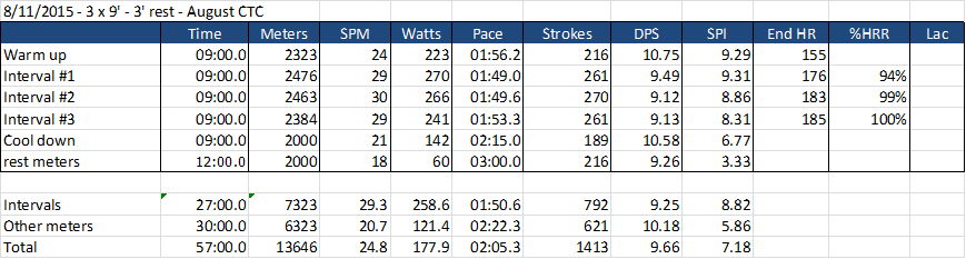 I was scheduled for a waterfall workout on the water (3K/2.5K/2K on 5′ rest), and my first thought was to just do that on the erg. That flowed pretty naturally into the idea of changing it to the time that it would take me to do those distances on the water (roughly 13.5′, 11.25′, 9′). When I did that and realized that this months Cross Team Challenge is 3 x 9′ on 3′ rest, I opted for that. It’s been tough enough to find a time to do the CTC, and to have a CTC that looks like a great threshold workout fall on threshold workout day when I’m stuck on an erg anyway. It seemed like an opportunity too good to pass up.