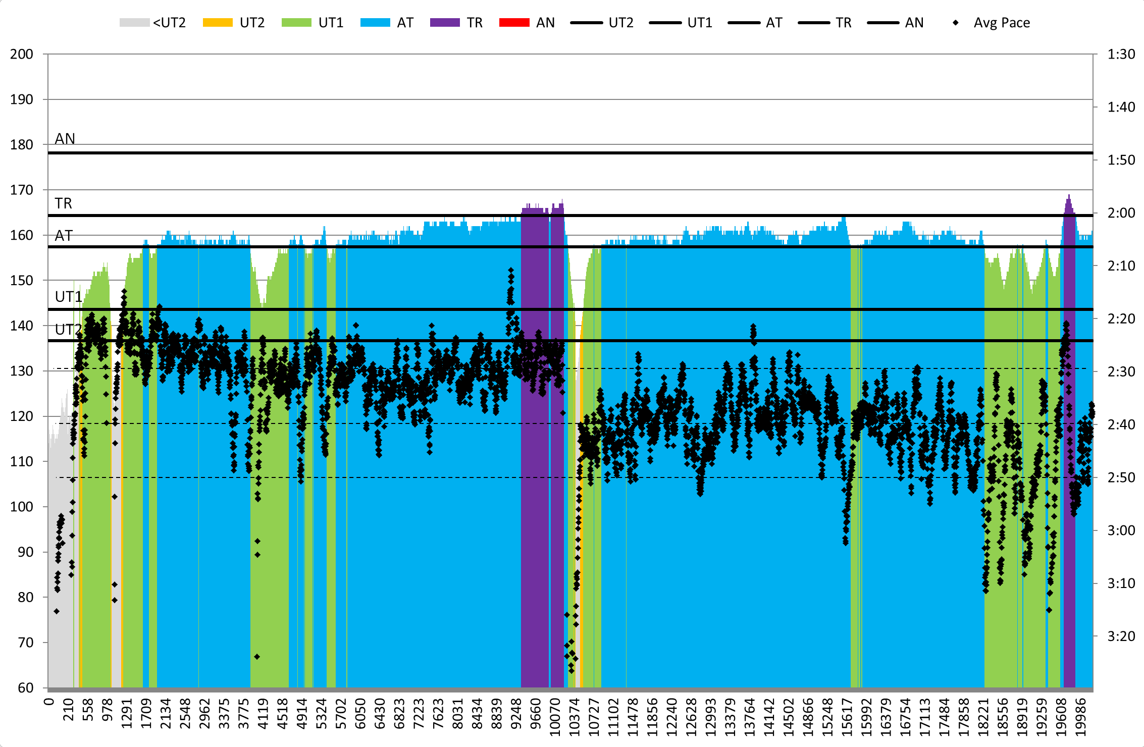 At the point where the speedcoach told me I had done 10K, I turned around and had a drink.  I’d been rowing for a bit more than an hour.  I then set myself up and got going in the other direction.  I discovered that I had a bit of a headwind to contend with, and I was getting a pretty tired.  I rowed upstream over the HOCR course and tried to pick out useful landmarks to use for different sections of the river.  After I passed the finish of the HOCR I slowed down and paddled through the narrow bit of the river.  Through the last 2 km or so I was gaining on a women sculling ahead of me.  I pushed the pace to cleanly pass her before we got to the North Beacon Bridge.