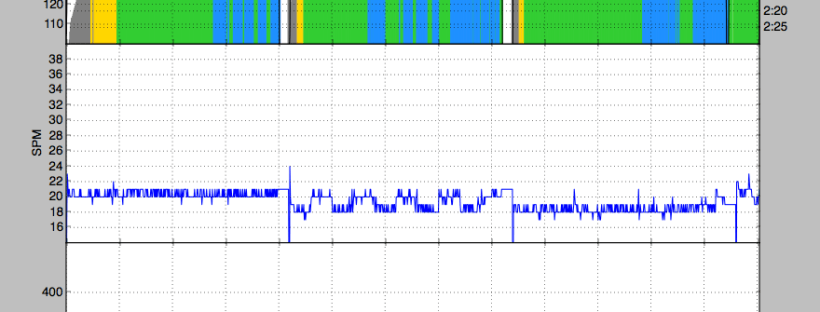 One interesting feature in the graph is in the last 20 minute piece, I decided to consciously work on increasing my drive length. I really reached at the catch and exaggerated my layback. This was from about 10 minutes to 15 minutes in the piece. No magic speed from it, but it is good to see the change reflected in the data because I was working on a changing the stroke.