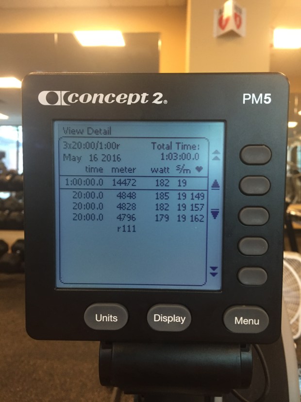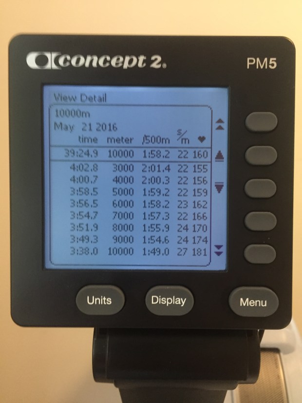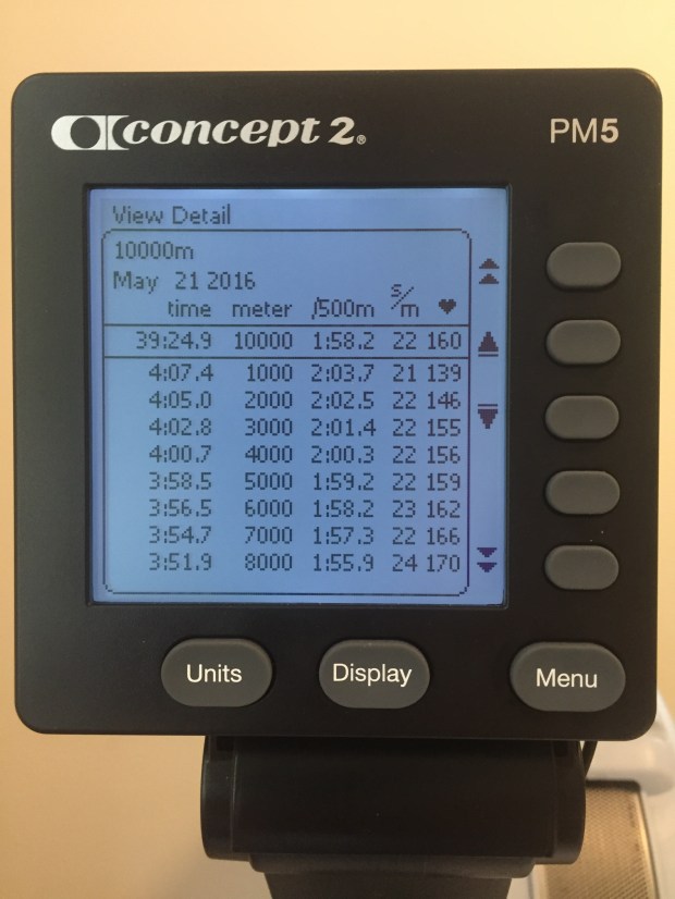 Saturday: Busy day, rushing around. shopping. Painting a ceiling. I managed to squeeze in an erg session. I wanted a bit of intensity, but I wasn’t in the mood to go really deep. So I decided to do a 10K push, but start off slower (at 2:04), and end at 1:55.