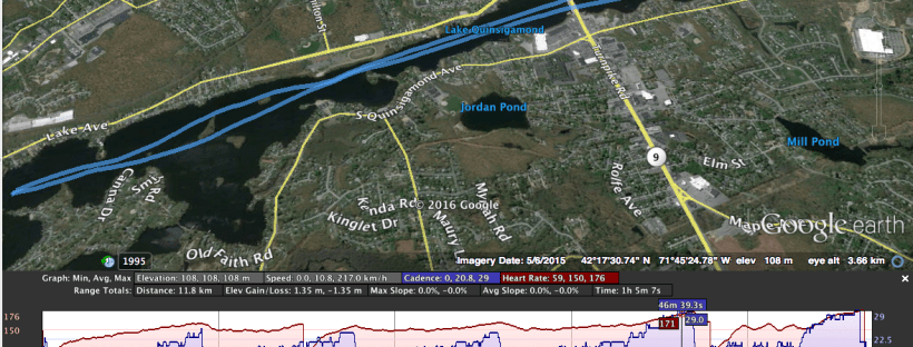 We started out from just north of the rt 9 bridge and headed south. The first ladder started at 2 minutes. We hit the south end of the lake at the end of the r20 section of the second ladder and turned around to finish the r22 and r24 sections. Rowing north was a treat. The boat felt light and I felt like our timing was working better. One challenge we have to work on is that Joe and I seem to want the boat to lean in slightly different directions. I always feel like the boat is leaning a bit to port. Another thing to work on is finishes. I noticed that my finishes were sloppier in a double than in the single, I imagine because the stroke is a bit quicker.