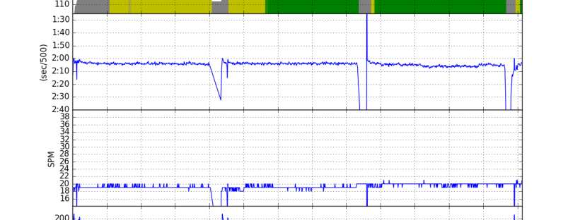 The first 20 minutes was fine. Lactate at the end was 1.9mmol/l. I missed the start for the second interval because I was running to get a water bottle. So, I was chasing the target power a bit. The power for the full interval read 182W, but I missed about 15 seconds of rowing at the beginning, so I was rowing >185W for the whole interval. I also was starting to sweat up a storm and feeling a bit overheated. At the end of the second interval, I read 3.2mmol/l. I suspect it might have been a bad reading, but I decided to back off the power to 180W for the last 20 minutes, and push the stroke rate up to 20 to keep things under control. It did the trick. My HR stabilized and my lactate level dropped back to 2.2mmol/l. by the end of 60 minutes.