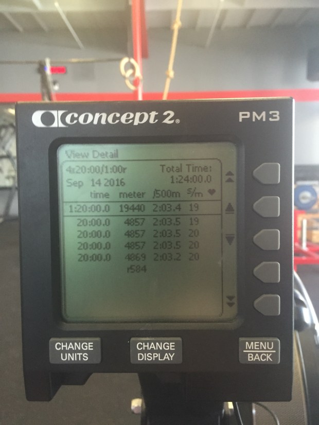 At Crossfit Anaerobic again this morning. I got there a bit later and there were very few people there. I dragged an erg over in front of a truly enormous boxed fan. Really it had to be at least 6 feet in diameter and it was right in front of an open exterior door. I had the most wonderful breeze for the whole workout.