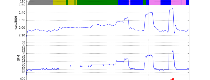 Workout Summary - media/20161118-181034-concept2-result-27823043o.csv --|Total|-Total-|--Avg--|-Avg-|Avg-|-Avg-|-Max-|-Avg --|Dist-|-Time--|-Pace--|-Pwr-|SPM-|-HR--|-HR--|-DPS --|05115|20:00.0|01:57.3|222.8|21.0|151.4|169.0|12.2 W-|05119|20:00.0|01:57.2|215.9|20.5|150.8|169.0|12.6 R-|00000|00:00.0|00:00.0|000.0|00.0|000.0|169.0|00.0 Workout Details #-|SDist|-Split-|-SPace-|-Pwr-|SPM-|AvgHR|MaxHR|DPS- 01|00991|04:00.0|02:01.1|185.3|17.9|129.6|139.0|13.9 02|01008|04:00.0|01:59.0|205.3|20.1|144.9|150.0|12.5 03|00777|03:00.0|01:55.8|222.5|21.9|152.7|155.0|11.8 04|00269|01:00.0|01:51.4|249.4|24.0|158.4|160.0|11.2 05|00141|00:30.0|01:46.4|285.2|25.8|161.8|164.0|10.9 06|00493|02:00.0|02:01.6|193.5|18.6|160.5|164.0|13.3 07|00299|01:00.0|01:40.5|336.0|28.0|162.4|167.0|10.7 08|00494|02:00.0|02:01.6|196.9|18.6|163.2|168.0|13.3 09|00157|00:30.0|01:35.7|393.4|31.2|163.5|168.0|10.1 10|00490|02:00.0|02:02.5|191.7|18.9|164.5|169.0|13.0