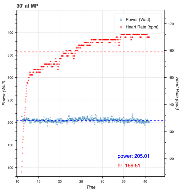 Here’s a quick comparison of the Thursday 20 minutes to the 30 minutes today. Today’s session is on the left and Thursday is on the right. On Thursday, see how I hit 167 after 20 minutes and the slope is pretty linear. Today, I plateaued around the 15 minute mark and drifted up slowly from there. I like that a bit better.