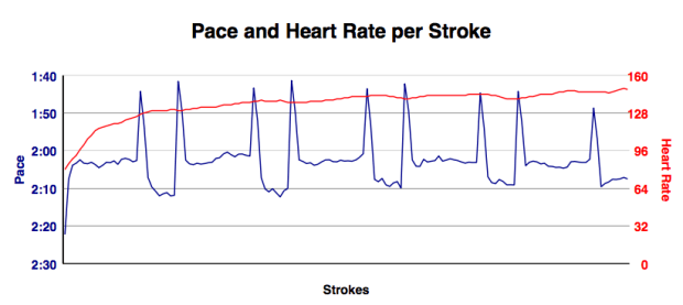 I had originally planned to try to row to a HR cap of 150, but my HR shot up so fast, and at such low power, that I decided to be satisfied to stay under 155. Sticking to 155 required my to row at a pretty low power, but at least I found an intensity that managed the HR drift.