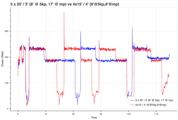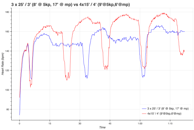Comparison to the 4 x 15′ (9′ @5kp, 6′ @ mp) workout form earlier this week.