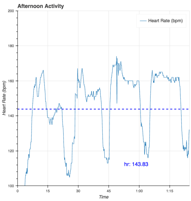 I decided that I would work from HR. I wanted the 6′ sections to bring me up into the range of 165-172 bpm, and the 9′ sections to bring me back down into the 150-160 range. I used the first interval to experiment. In the first 6′ interval, I started at 4.5 mph and within a minute, I knew that was way to aggressive. I backed off to 4mph and even that was a genuine struggle. My HR monitor picked the wrong day to act up. You can see in the plots that there were dropouts and lags. It might be time for a new battery. The 9′ sections were fine at about 3.1 mph