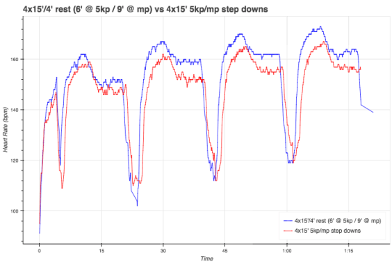 Monday: 4 x 15′ / 4′ rest (6′ @ 5kp, 9′ @ mp)