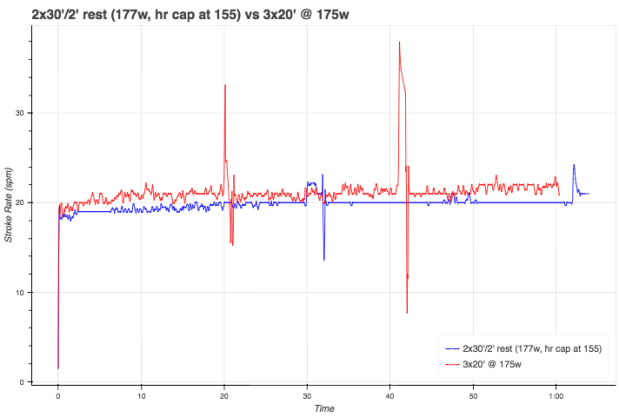 Heart rate climbed fast and didn’t settle. Comparing it to similar workouts. Here it is versus a 2 x 30 before I travelled last week.