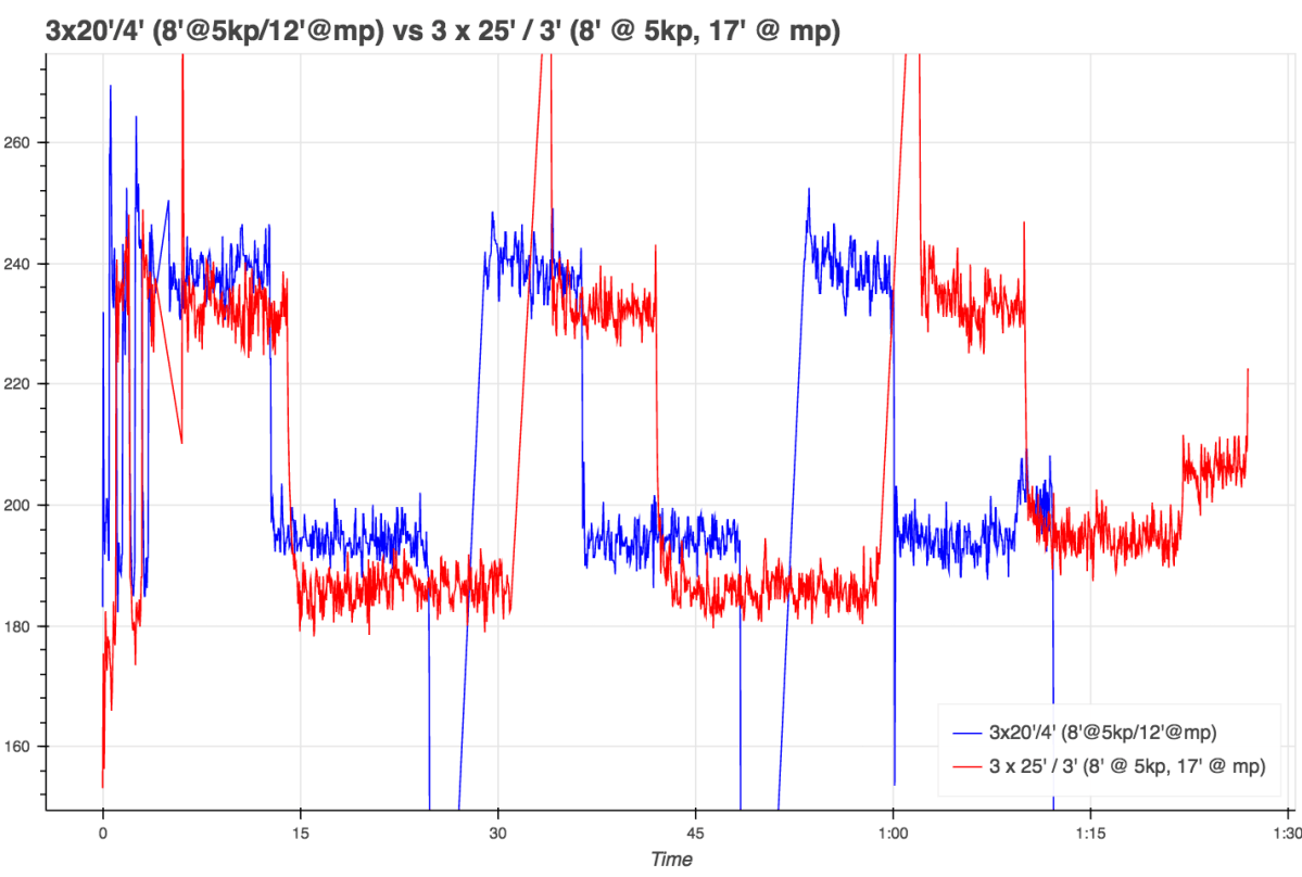 Friday: 3 x 20′ / 4′ (8′ @ 5kp, 12′ @ mp)
