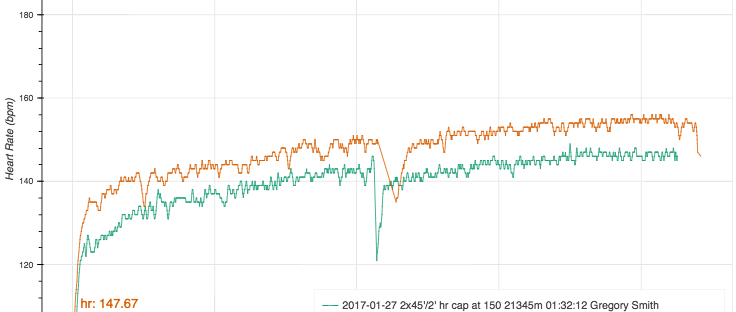 The workout was uneventful. My HR shot up a bit quicker than it should have, but plateaued around 150 for the first piece and 155 for the second.