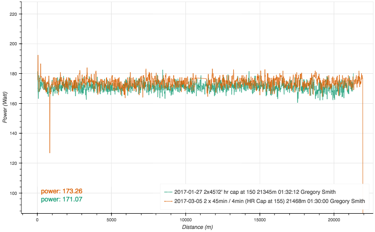 Sunday: 2 x 45′ / 4′ rest (HR cap at 155)