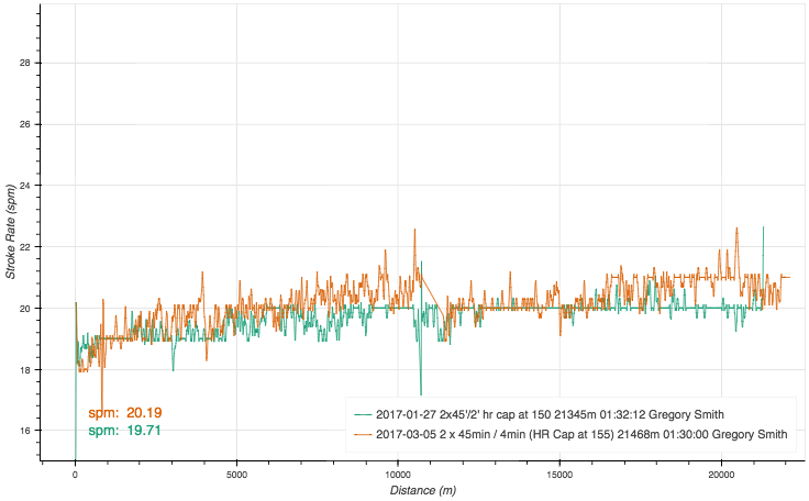 Sunday: 2 x 45′ / 4′ rest (HR cap at 155)