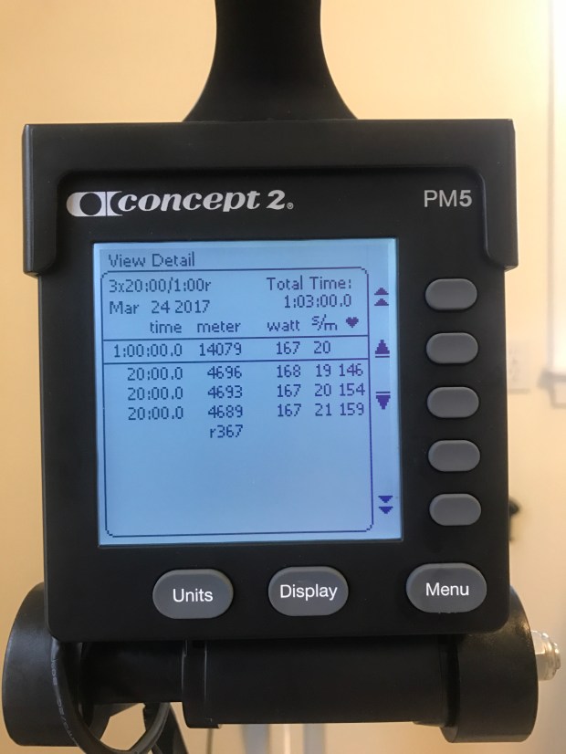 Working from home seemed to be the most intelligent thing to do, so I did. I had meetings from 9am to 1pm. At that point I jumped on the erg for an easy endurance session to work the kinks out. With that little sleep, I had low expectations.