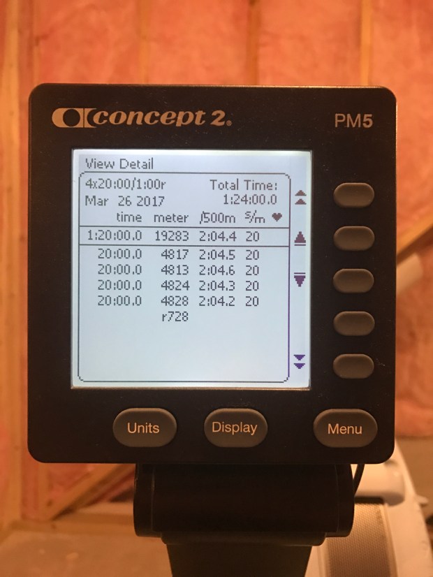 I decided to do a 4×20′ session. Since I didn’t have a HR monitor to keep me honest, I immediately decided to row faster, targeting 2:05 instead of 2:08. It actually went really well. I felt strong and relaxed through the whole workout.