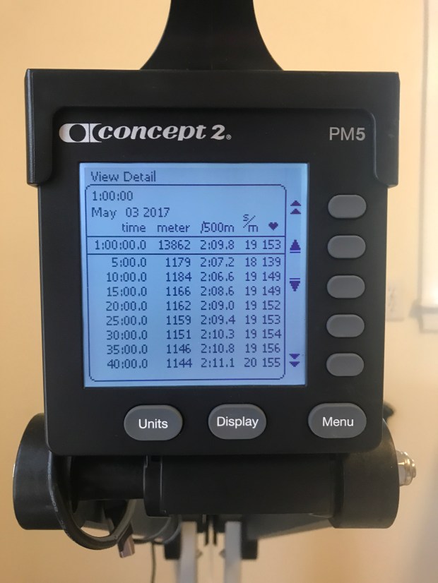 I went home, crawled in bed around 8:30 and slept until noon. I had a couple of conference calls and decided to do an hour on the erg around 3:30.
