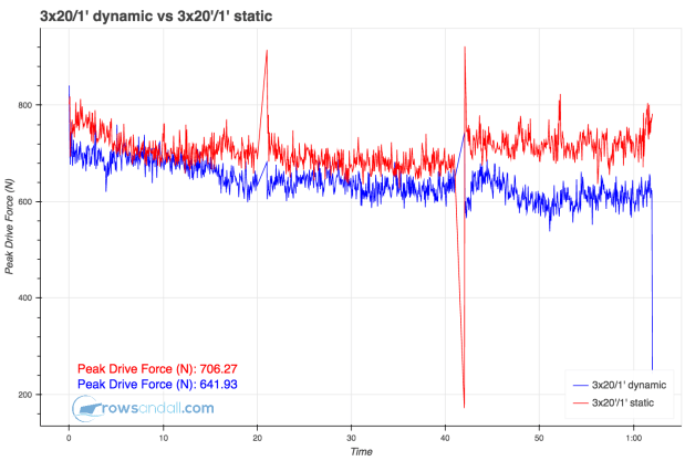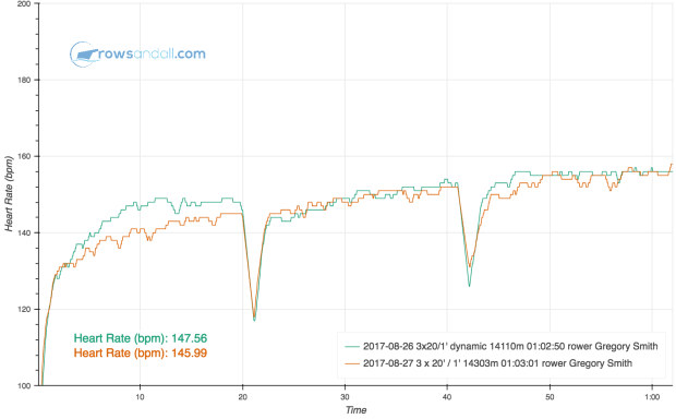 There was a ski boat out at the same time as us. He nailed us in the middle of our first interval, and then again with 30 seconds left in the third interval. We were free and clear after that. With the head wind we were a bit slower than I thought we’d be, but I was also rowing a bit lighter than I normally would, trying to be careful of my back.