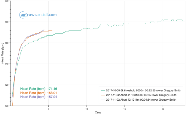I wanted to compare these failures to the reasonably successful 6K session that I did on October 9th. The orange trace was the first attempt. You can see I started at about 265W and faded a bit toward 250W through the first 5 minutes. The HR response was much higher today than in the 6K test. It seems pretty clear that that the fatigue from the first attempt was effecting the HR for the second attempt.