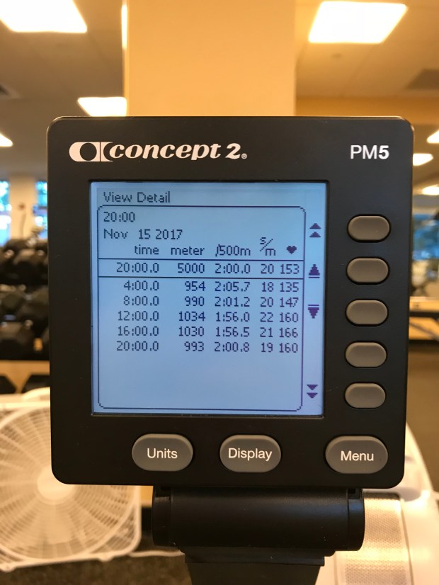 Workout Summary - media/20171115-1315300o.csv --|Total|-Total-|--Avg--|-Avg-|Avg-|-Avg-|-Max-|-Avg --|Dist-|-Time--|-Pace--|-Pwr-|SPM-|-HR--|-HR--|-DPS --|04996|20:02.0|02:00.3|212.2|20.7|148.7|167.0|12.0 W-|05001|20:02.0|02:00.2|206.7|20.3|148.0|167.0|12.4 R-|00000|00:00.0|00:00.0|000.0|00.0|000.0|167.0|00.0 Workout Details #-|SDist|-Split-|-SPace-|-Pwr-|SPM-|AvgHR|MaxHR|DPS- 00|00945|04:00.0|02:07.0|173.4|17.7|119.9|135.0|13.3 01|00990|04:00.0|02:01.2|196.5|20.0|142.7|147.0|12.4 02|00765|03:00.0|01:57.7|214.4|21.8|151.8|156.0|11.7 03|00268|01:00.0|01:52.1|245.5|23.8|157.9|160.0|11.3 04|00140|00:30.0|01:46.9|284.8|26.2|160.8|162.0|10.7 05|00478|02:00.0|02:05.5|184.9|18.8|160.8|164.0|12.7 06|00288|01:00.0|01:44.2|302.4|26.5|159.4|165.0|10.9 07|00483|02:00.0|02:04.3|189.4|18.5|163.3|166.0|13.1 08|00150|00:30.0|01:40.1|352.2|29.1|160.0|161.0|10.3 09|00494|02:02.5|02:03.9|198.4|18.9|163.9|167.0|12.8