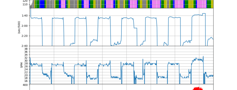 I played it safe in the first 5. It also took a bit of practice to rate up and keep my stroke smooth. I tried to remember the posture stuff from yesterday, mainly tried to keep my knees down at the beginning of the recovery. In the last three I started to push harder with the end in sight. I really pulled out the stops for the last one.