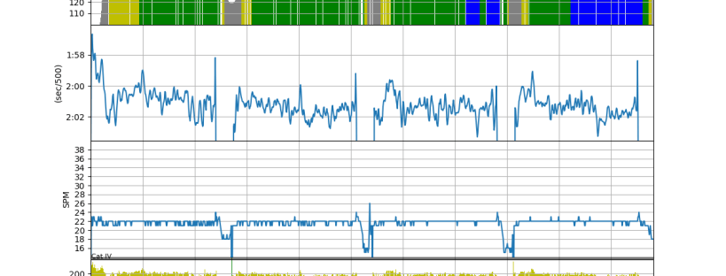The main point of this workout is precision. Hitting exactly the target split at exactly the target rate. In addition, it’s a good chance for me to work on recovery sequence (keeping my knees down)