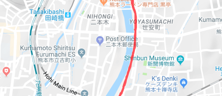 The hotel is located in Kumamoto, right along a river with paths along the banks, so I just started running along the near side of the river. I crossed to the other side when the path on my side was blocked by construction, then I kept going until I ran out of path. Then I turned around and headed back.