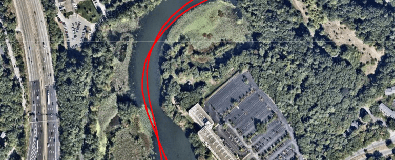 And I ran into a tree! I was just starting. I left the dock, rowed into the turn. I cut close to the north bank coming into the last bit of the turn, and I usually swing wide while I build some speed into the straight bit. I alway look over my port shoulder because I can see the whole straight bit without turning too much. What I missed by doing that was a huge tree that had fallen into the river on the east bank. I saw it about 5 strokes later and checked down hard. I managed to take all the speed off the boat and gently coasted into a tangle of the upper branches.