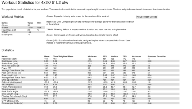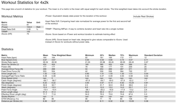 Lots of missing strokes. Which messed up the summary. But the workout was great. Very challenging at the end. By using the flex plot and suppressing all strokes below 24 spm and all strokes with a WpS below 200, I could get an idea of the interval power. Here is is shown as an avg of 320. (1:43 pace)