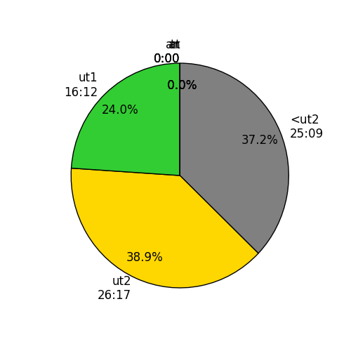 Well, to get faster over typical 1K to 6K race distances, we need to have both power and endurance. But we need a way to organize the training so that we get the benefit of power development, while minimizing the how much we can move the cross over point to the right. Luckily, a lot of people have done a lot of good work to figure this out. One of them is Stephen Seiler, and wrote a great survey paper about it. It seems the an optimal approach is to put in about 80% of your training time at low intensity and 20% above. This has been shown to be a good ratio for elites who train a ton. and for recreational athletes (like me).