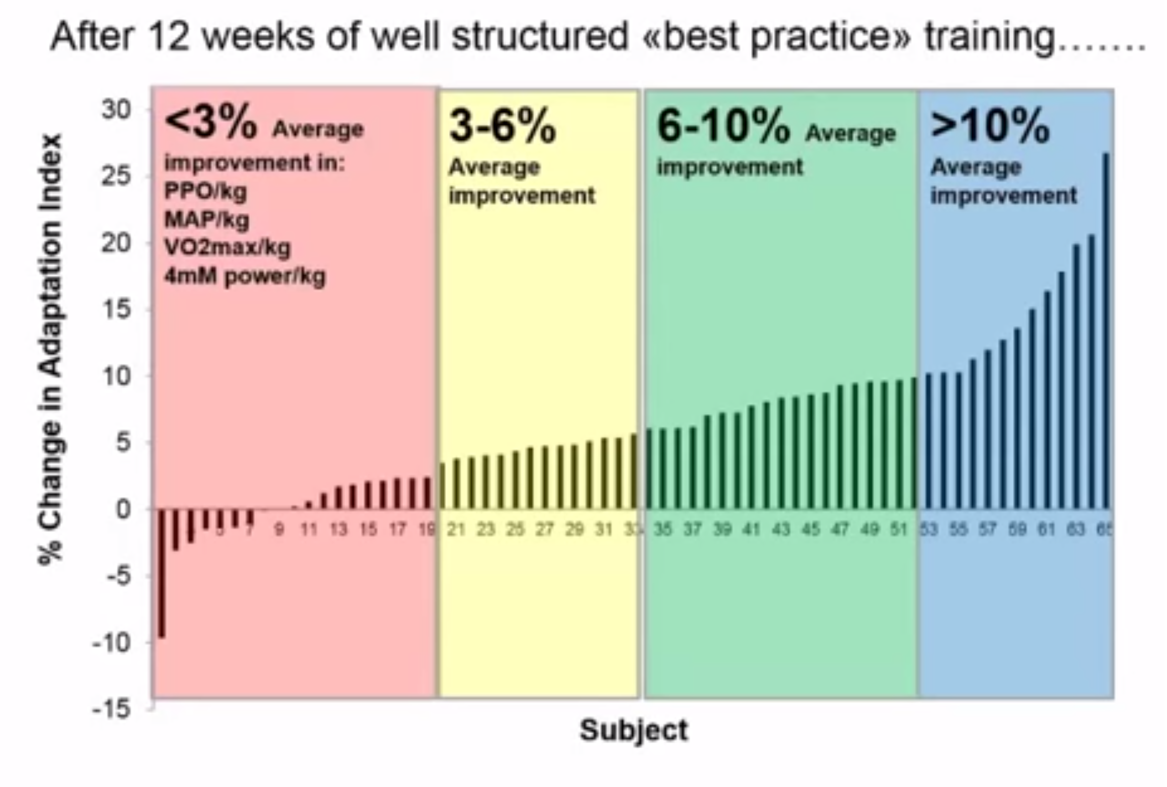 The next bit of Seiler wisdom that I found helpful was a study about individualization of training. I have previously written about it here. The great thing about this study was reinforcing just how big the differences in response was between different athletes for the same training stimulus. He cited a study that was comparing different approaches to block periodization. There was a slight, statistical advantage to one approach, but the variation of response between athletes in each training group was much larger. His conclusion was that the same approach will not work for everyone. This is a pretty important lesson to learn since there are a lot of people who will cite their own results (or a national team’s results) as “proof” that a certain approach works.
