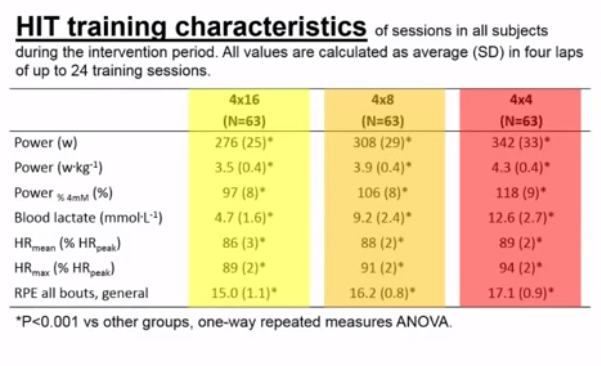 The next level of the pyramid is High Intensity Training. The point here is that you need more than just the long slow stuff to actually improve. In addition, you need training that is hard enough to push your heart rate to 90% of your max, or higher to deliver adaptation. So, within that framework, I guess it is safe to safe that “No Pain / No Gain”. He discusses potential ways to do High Intensity Training and cites a study comparing 4 minute, 8 minute, and 16 minute intervals. He didn’t show this in the video, but it summarizes the finding of that study.