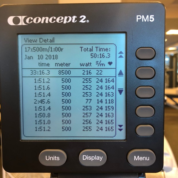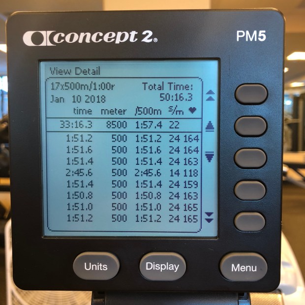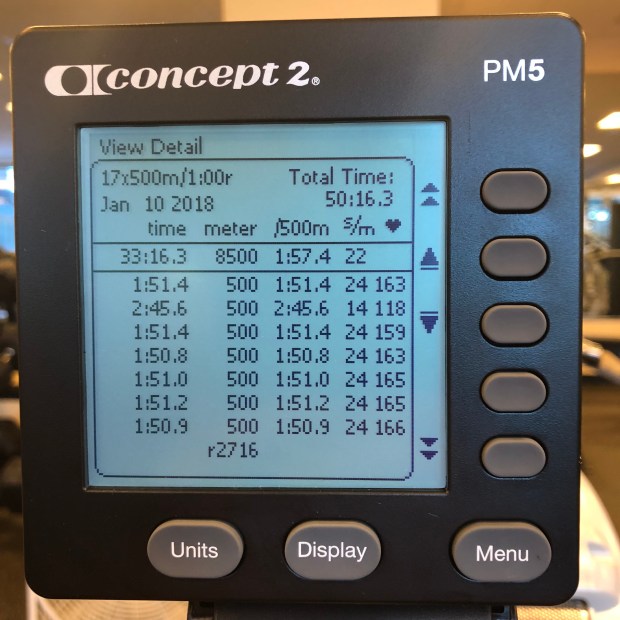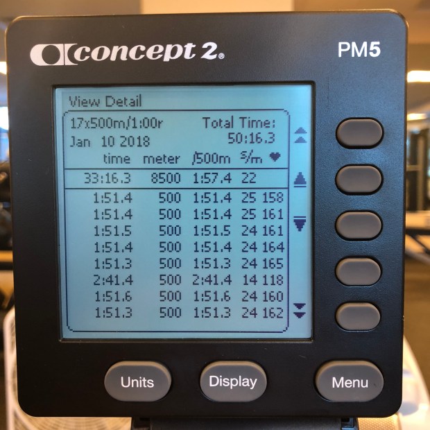 My pace was 2:14.9 this year. I did this race in 2015 in similar conditions and my pace was a 2:12.9. Here is a link. 2015 was my best year at the HOCR. Comparing the two races, I pushed hard in 2015, with the last 5 minutes above 178 bpm. My rowing looks very similar. I am probably about 15 lbs heavier now. I am ever the optimist and when you put all that together, I come to the conclusion that I can get back to and even exceed where I was in 2015. As always, it comes down to weight, technique and fitness.