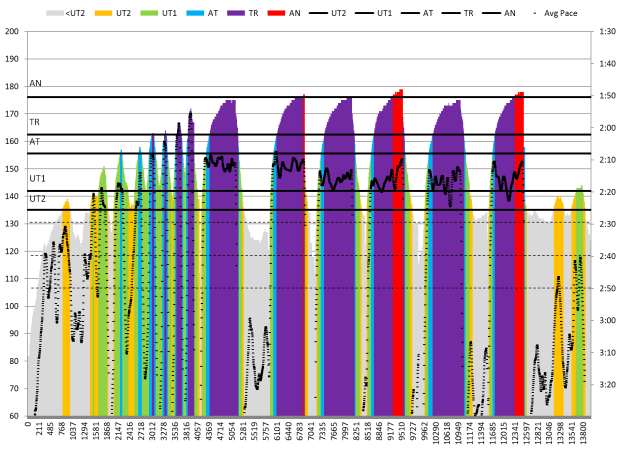 I managed the 8×500/3’30” at a 1:44 pace. When I have been doing the Pete Plan, I saw a 2 to 3 second delta between the pace for 8×500 and 4×1000. I am also interested in building some success here, so I decided to set a reasonably soft target, 1:48.