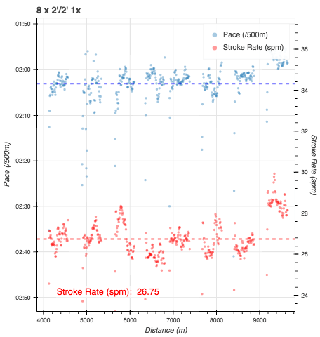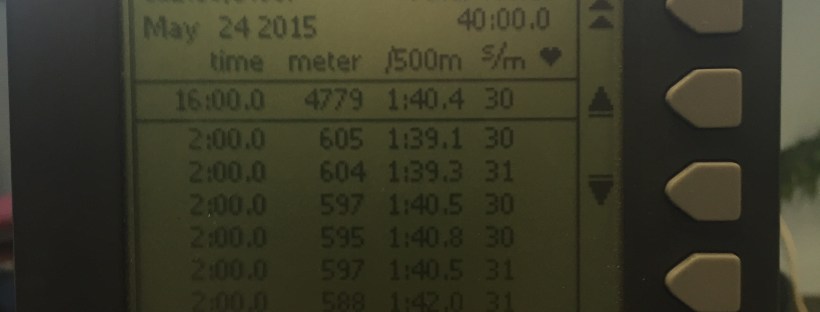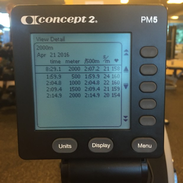 There was a ski boat out at the same time as us. He nailed us in the middle of our first interval, and then again with 30 seconds left in the third interval. We were free and clear after that. With the head wind we were a bit slower than I thought we’d be, but I was also rowing a bit lighter than I normally would, trying to be careful of my back.