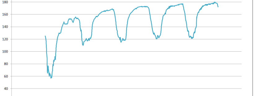 Note: the pace shown here appears to be the GPS based pace, so the downstream intervals are unnaturally fast and the upstream ones are slow. Calculating pace for them using the excel data yields 2:12.8, 2:17.9, 2:14.5, 2:19.9.