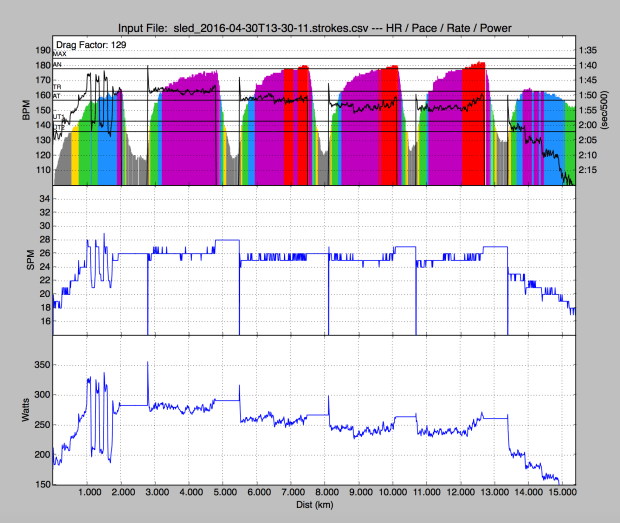 So, what do we make of this? First, it was probably an effective workout from a physiological point of view. I had 27 minutes in the TR and AN HR zones. But in terms of grit, this one was a fail. Also from a discipline perspective, also a fail. I should have rowed it conservatively and gotten a good marker for the next session.