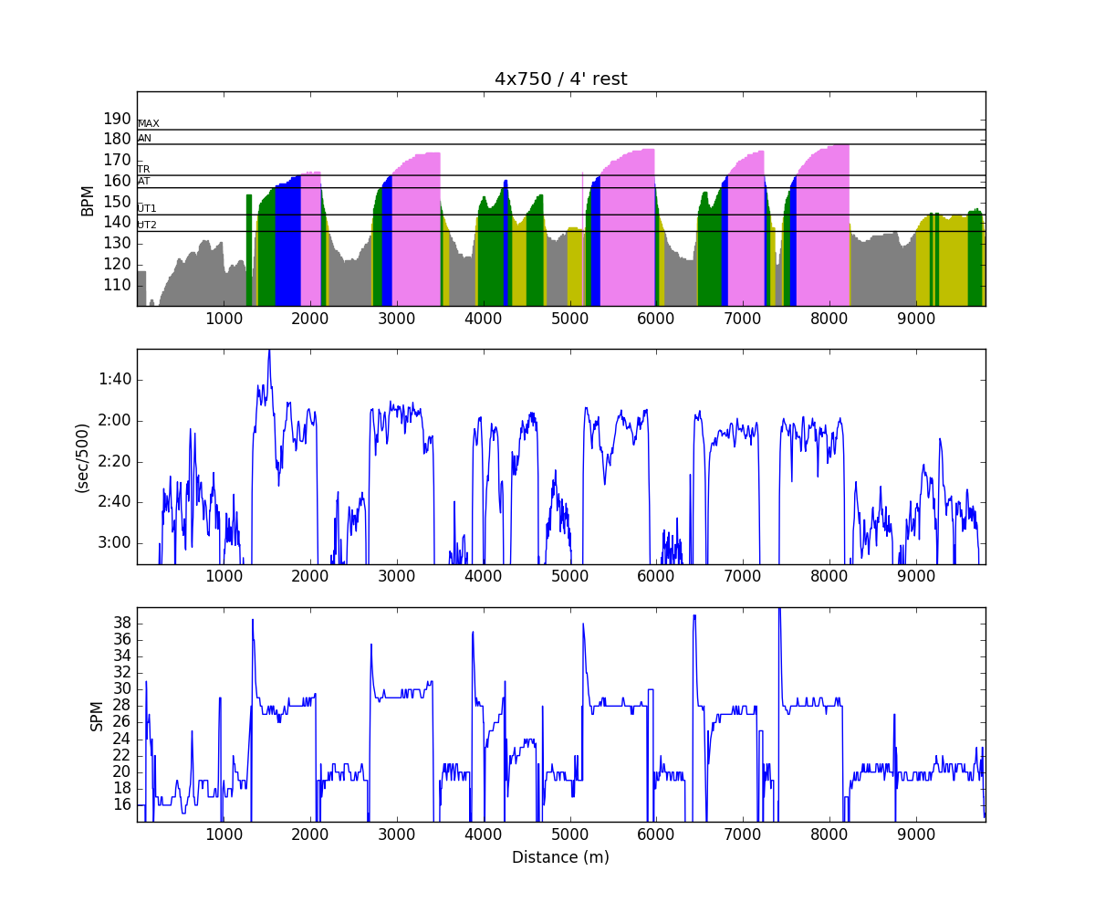 But, I’m pretty happy that I stuck it out. I experimented with different stroke rates and ended up feeling most comfortable at 26/27 and I worked to lengthen my stroke after the first three intervals. You can see that in the drive length plot.