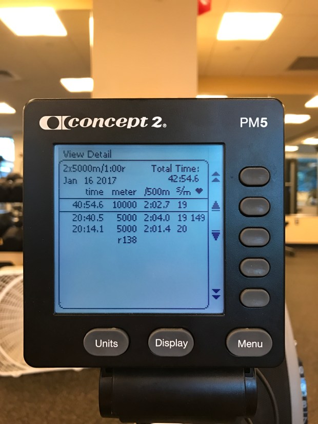 So 30 minutes at marathon pace, and then an exploratory session on the skierg. The workout did not go very well. It was hard work to sustain even the low end of the marathon pace band and my heart rate was way high. It might have had something to do with not enough sleep, too much alcohol and way too much stress. In any event, I was just glad to have had the chance to do a little training.